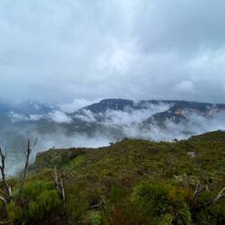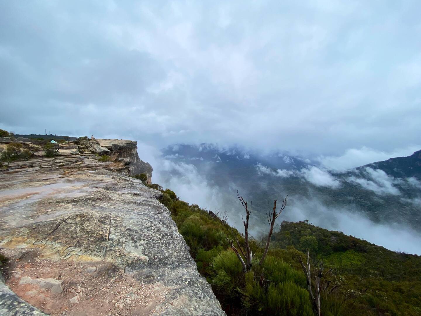 Zum Glück sind wir hingelaufen. Es handelt sich dabei um ein fast 100 Meter langen Felsen, der über einem Tal der Blue Mountains thront. Man hat einen unglaublichen Ausblick auf das Tal und die Steinwände auf der anderen Seite des Tals. Es ist einzigartig wegen dem Wetter. Wolken ziehen durch das Tal und verleihen der Szenerie einen mystischen Touch.