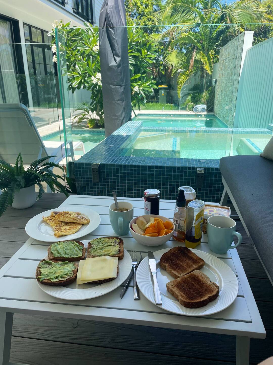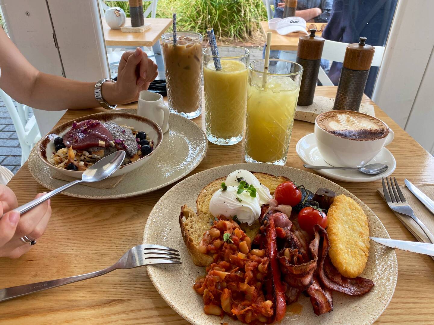 Mit spätem Wecker um 9 Uhr begann unser heutiger Tag. Anita hatte am Vorabend ein nettes Café in der Innenstadt von Port Macquarie, wo sie gerne vor 11:30 Uhr essen will, weil ihr die Frühstückskarte so gut gefallen hat. Für Anita gab es eine Granola mit einer pinken Birne. Ich wählte das große Frühstück. Dazu gab es leckere Säfte, womit wir unser Vitamin-Level auffüllten.