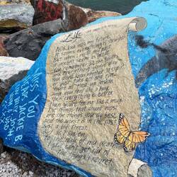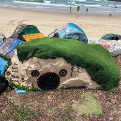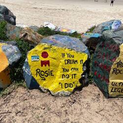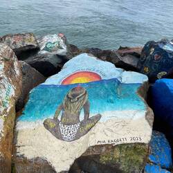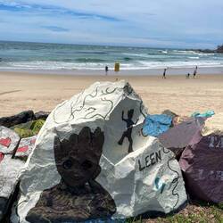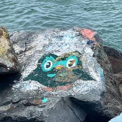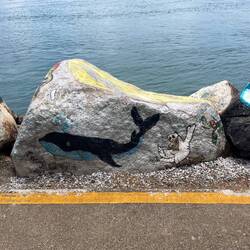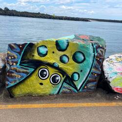 Von dort aus überlegten wir uns spontan, wie wir weiter machen und sahen, dass wir nicht weit vom Meer entfernt sind. So ließen wir das Auto dort und gingen die entgegengesetzte Richtung zum Wasser. Wir kamen zu einem Weg, der direkt am Meer entlangführt und von zahlreichen Menschen ebenfalls genutzt wird. Das spannende an diesem Weg war, dass die Steine am Ufer teilweise bemalt wurden. Wir liefen etwa 2 Kilometer und mindestens jeder Fels direkt am Weg hatte ein anderes Thema. Teilweise waren 2-3 Reihen dahinter ebenfalls bemalt. Es war eine unglaubliche Idee!