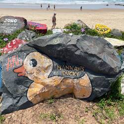 So gab es Familien, die sich beispielsweise als „Simpson“-Figuren auf einem Stein verewigten und daneben die Jahreszahlen, wann sie wohl immer da waren. Es gibt zahlreiche Familien, die wohl über 20 Jahre jedes Jahr diesen Ort besuchen. Es gab Disneyfiguren, Tiere, Blumen, Muster, Sprüche und auch Gedenksteine für Verstorbene. Auf der anderen Seite auch wieder Metallplatten, womit Ehepaare ihr 50 jährige Bestehen zelebrieren. Ein großer Topf an zahlreichen Emotionen.