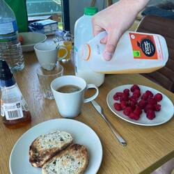 Mit dem Wecker wachen wir in unserer Unterkunft in Freycinet auf. Wir dürfen noch das Geschirr abspülen und die dank Anita gewaschene Wäsche in den Koffern verstauen. Parallel haben wir ein kleines Frühstück aus Kaffee, Orangen-Mango-Saft und Zimt-Donuts. Um kurz vor 10 Uhr haben wir alles in den Koffern und anschließend im Auto verstaut.