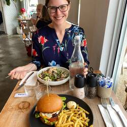 Zum Abendessen gehen in wir in das wirklich nah gelegene Bahnhofs-Café und beginnen mit einer Runde Kaffee. Später bestellen wir uns dort auch noch unser Abendessen bestehend aus Burger, Pommes und ein Salat. Von den Strapazen der Fahrt erholt, geht es zurück ins Hotel und ins Bett.Read more