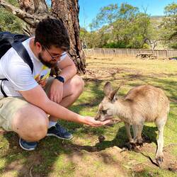 Damit war die Tour beendet und wir liefen den restlichen Park ab. Als nächstes kamen wir zu einem Papageien, der es liebte sich uns zu präsentieren. Ein wirklich schönes Tier. Wir fütterten noch ein paar Kangaroos und sahen einem kleinen Wombat zu wie es frass. Anschließend machten wir uns zum Auto und fuhren weiter.