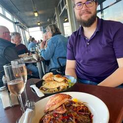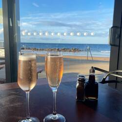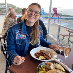 Die biologische Hürde war geschafft. Wir hatten noch Zeit bis zum Abend und so entschieden wir uns im nächstgelegenen Fisch-Restaurant uns ein Abendessen zu bestellen. Anita wählte einen tasmanischen Lachs auf Gemüse-Bett, während ich einen tasmanischen Fisch auf Caesar-Salat wählte. Beide waren unglaublich lecker und wir genossen das Essen mit einem Glass Sekt, während die Sonne unterging.