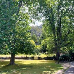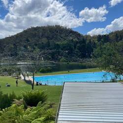So starten wir kurz nach Mittag mit unserem Spaziergang und laufen zunächst den Hang hinunter, um zu einer Parkanlage zu kommen. Von der Kart eher weiß ich, dass es dort 1-2 Brücken und sogar einen kleinen Sessellift über den Fluss geben soll. Es ist eine wirklich schöne Anlage und wir laufen am Rand herum. Es gibt einen kleinen Bergsee und ein Outdoor-Schwimmbecken daneben.