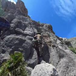 Hier haben wir kurz angehalten um den Caminito del Rey anzuschauen und haben lauter Haken in der Felswand gesehen. Also haben wir die Klettersachen angezogen und die Routen ausprobiert die machbarBaca lagi