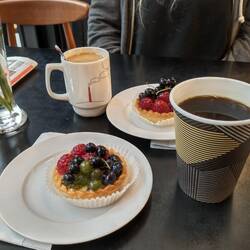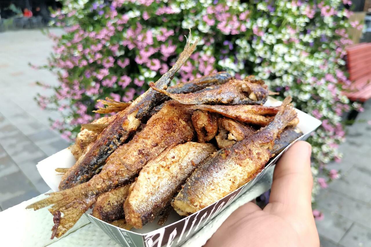 Es ist ein kleiner Fisch namens Maräne der erst ein Mehlbad bekommt und dann gebraten wird.... und Kuchen zum Nachtisch! 🙂