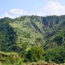 Wir hinterher, und der Weg geht immer mehr den Berg hinauf. Was wir dann sehen ist eine Terassenlandschaft im saftigen grün, wunderschön!