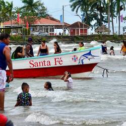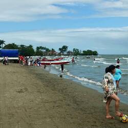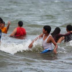 Rechts von der Straße geht es zum Strand, wo sich viele Einheimische am und im Wasser tummeln.