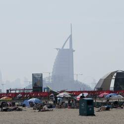 Strand ohne Ende, auf der einen Seite Burj Al Arab, auf der anderen Seite die Megacity um Burj Kalif.
