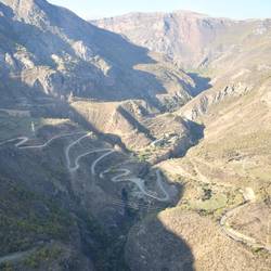 Die Abfahrt ist nicht weniger beeindruckend und es wird immer grüner. Zuerst merkt man das wir Herbst haben. Die Bäume und Sträucher sind gefärbt. Dann sehen wir Schnee bedeckte Berge, bis zu 4800Baca lagi