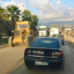 Die Kreuzung ist inzwischen verstopft und ein ander Fahrer fragt wo wir hin wollen. Jobo sagt nach Shkodar. Er zeigt wir sollen in die Baustelle fahren und der Bauarbeiter lässt uns passieren.