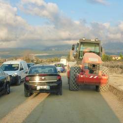 Die Straße wir komplett neu gemacht und wir fahren mitten durch die Baufahrzeuge, unglaublich.