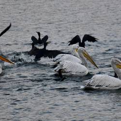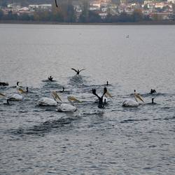 Der Weg ist eine wunderschöne Platanen Allee, direkt am Wasser. Zuerst sehen wir Reiher und Kraniche. Dann sehen wir Pelikane, frei lebende Pelikane, wir können es kaum glauben.Leggi altro