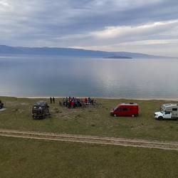 Unser Stellplatz liegt an einem Kloster direkt am Strand des Baikalsees. Ein bisschen Hilfe brauchte der ein oder andere, bis jeder seinen Platz gefunden hatte.