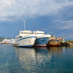 In Baikal angekommen soll es mit der Fähre weitergehen, doch die kommt nicht weg vom dem Kai und ein Schlepper muss zurLue lisää