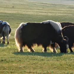 Nun stehen wir in der Steppe, nicht weit von der Straße und doch total einsam. Nur ein paar Kamele und Jaks in Sichtweite.