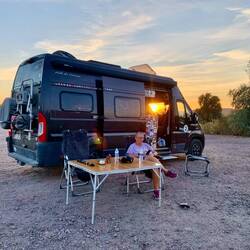 Die Nacht war mit 5 Grad frisch, aber zum frühstücken sitzen wir draußen im Windschatten.