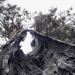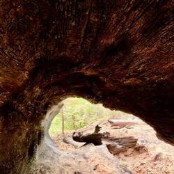 Cool ist der Baum „Palace Hotel“. Darin haben wir Pause gemacht. Er ist innen komplett abgebrannt, lebt aber immer noch.