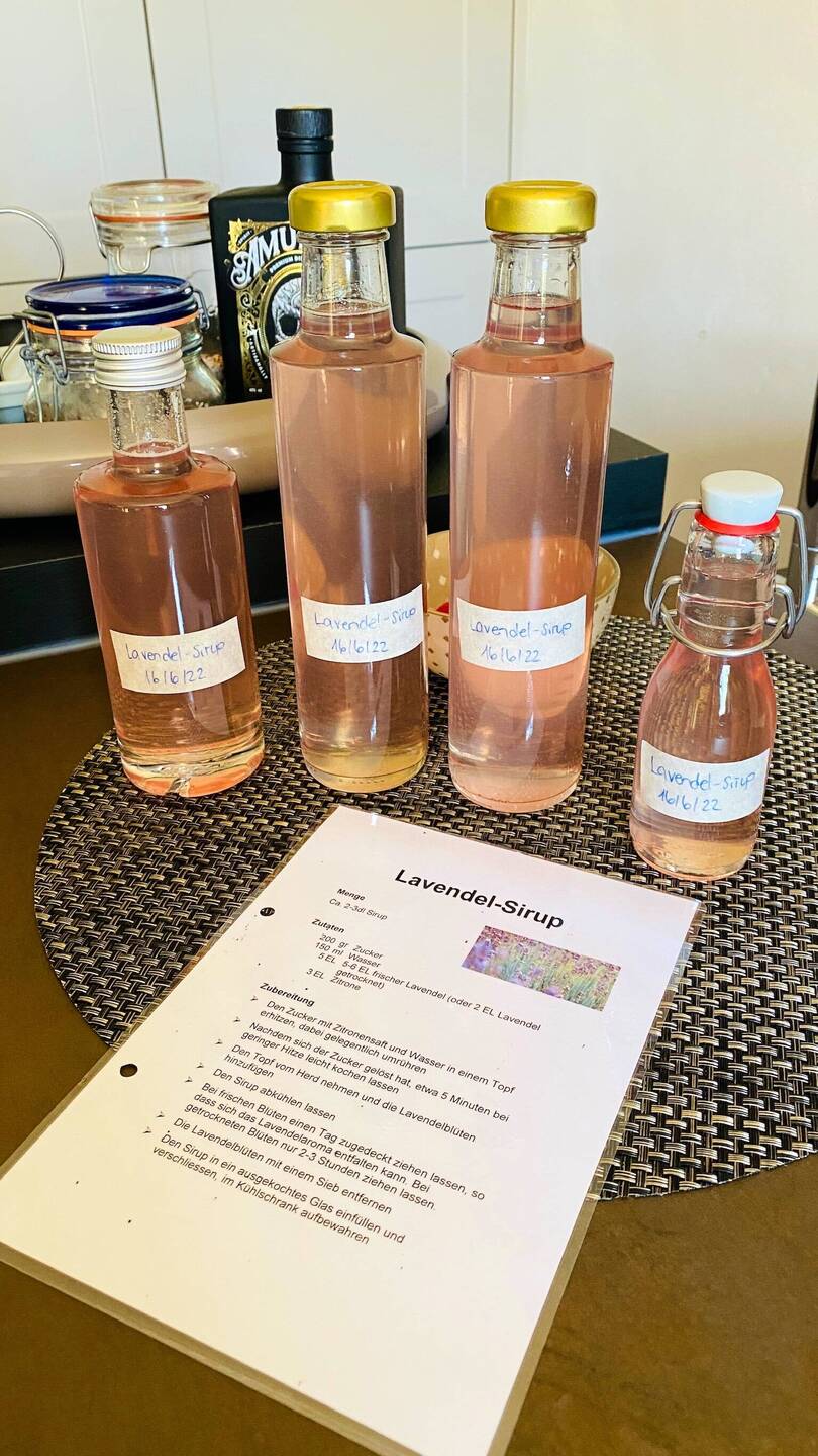 Hier noch der Lavendelsirup, er hat nun schön über Nacht gezogen, nun ist er abgefüllt in Flaschen zum Verzehr oder Verfeinern von Glacé, Gin Tonic, Sekt usw.