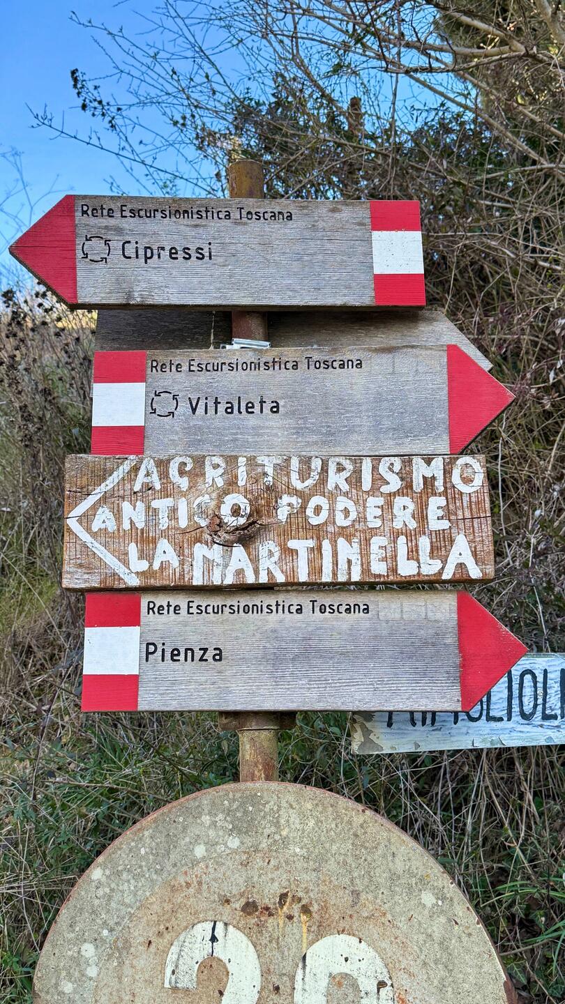 Nach einem herrlich leckeren Kaffee in San Quirico d’Orcia schnüren wir unsere Wanderschuhe. Heute geht es zu Fuss nach Pienza – rund 7 Kilometer mit etwa 300 Höhenmetern liegen vor uns. Laut Wikiloc eine gemütliche Halbtagestour. Die Route zeichnen wir auf Komoot auf, doch schon bald merken wir: Die Wege sind bestens ausgeschildert. Und so viel sei vorweggenommen – wir kommen problemlos ans Ziel!