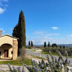 Zunächst führen uns kleine Wiesenwege aus dem Dorf hinaus. Schon nach kurzer Zeit erreichen wir eine kleine Kapelle nahe der Hauptstrasse. Rosmarin blüht üppig, Bienen summen geschäftig – der Duft liegt in der Luft. Die toskanische Landschaft zeigt sich von ihrer schönsten Seite.