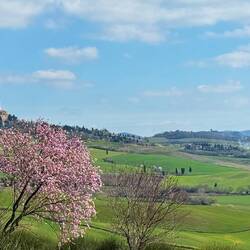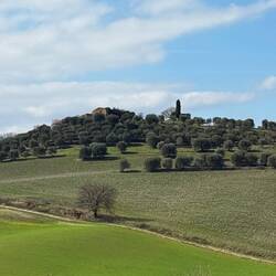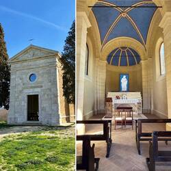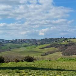 Über eine weite Ebene geht es weiter Richtung Pienza. Die Beine werden langsam schwer, und zum Schluss fordert uns der Weg nochmals mit einem ordentlichen Anstieg. Unterwegs passieren wir eine weitere Kirche mit wunderbarem Ausblick über die Hügel – fast erwartet man, dass gleich Maximus aus Gladiator um die Ecke reitet.