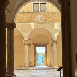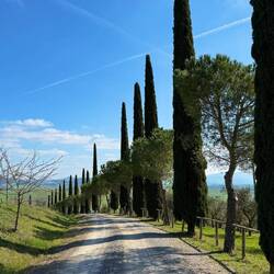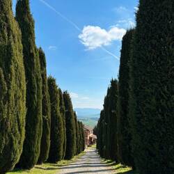 In der Ferne entdecken wir bald eines der ersten Highlights: eine ikonische Zypressenallee, bekannt aus dem Film Gladiator mit Russell Crowe. Je näher wir kommen, desto klarer wird die Szenerie, die man aus dem Film kennt. Durch ein Tor werfen wir einen Blick auf das berühmte Motiv – und sind natürlich nicht die Einzigen, die hier stehen und fotografieren.