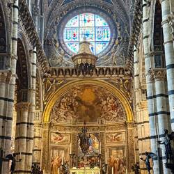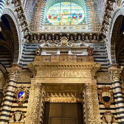 Ein weiteres Highlight ist die Piccolomini-Bibliothek. Ihre farbenprächtigen Fresken erzählen aus dem Leben von Papst Pius II. und wirken erstaunlich lebendig. Man spürt förmlich den Geist der Renaissance. Auch die kunstvoll gearbeitete Kanzel beeindruckt – ein Meisterwerk, das man sich unbedingt aus der Nähe ansehen sollte.