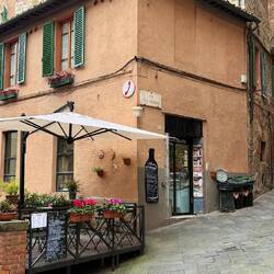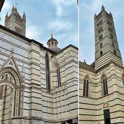 Beim Schlendern durch die verwinkelten Gassen taucht plötzlich die imposante Fassade des Doms von Siena vor uns auf. Weißer, schwarzer und rosafarbener Marmor leuchten im Tageslicht – ein beeindruckendes Farbspiel, das sofort klarmacht, welch bedeutende Rolle Siena im Mittelalter spielte.