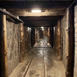Pünktlich um 15:00 Uhr geht es los. Ausgerüstet mit Helm werden wir von unserem Guide abgeholt – einem ehemaligen Bergmann mit über 30 Jahren Erfahrung. Schon die Einfahrt ist spektakulär: In einem originalen Förderkorb fahren wir 320 Meter in die Tiefe – in nur 80 Sekunden. Ein Moment, den man so schnell nicht vergisst.