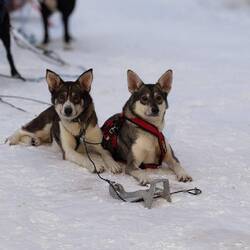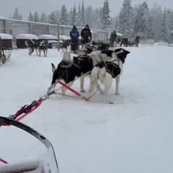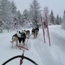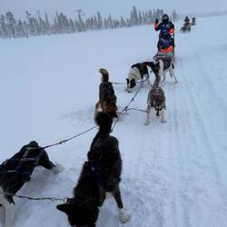 Heute geht es mit den Huskys auf eine 10 km lange Fahrt durch die frisch verschneiten Wälder und Ebene.