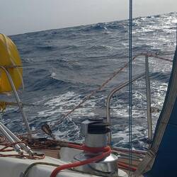 Une houle progressivement grandissante nous accompagne par l'arrière occasionnant de jolis surfs. Les routages météo sont assez changeants : les critères que je fournis à leur élaboration sont : vents < 25nd et houle <3m. Il se trouve qu'une zone un peu plus inconfortable (en théorie) nous attend d'ici 48h avec des rafales à 30nd et une houle de 3m. Cette zone concerne le nord de notre route directe puis descend plus au sud, autrement dit les routages ne peuvent proposer d'autres solutions : soit on le traverse par le nord soit par le sud, le difference est minime. Je choisis de suivre la route la plus directe, celle qui permet de garder le vent 3/4 arrière et surtout la houle arrière, beaucoup moins inconfortable.