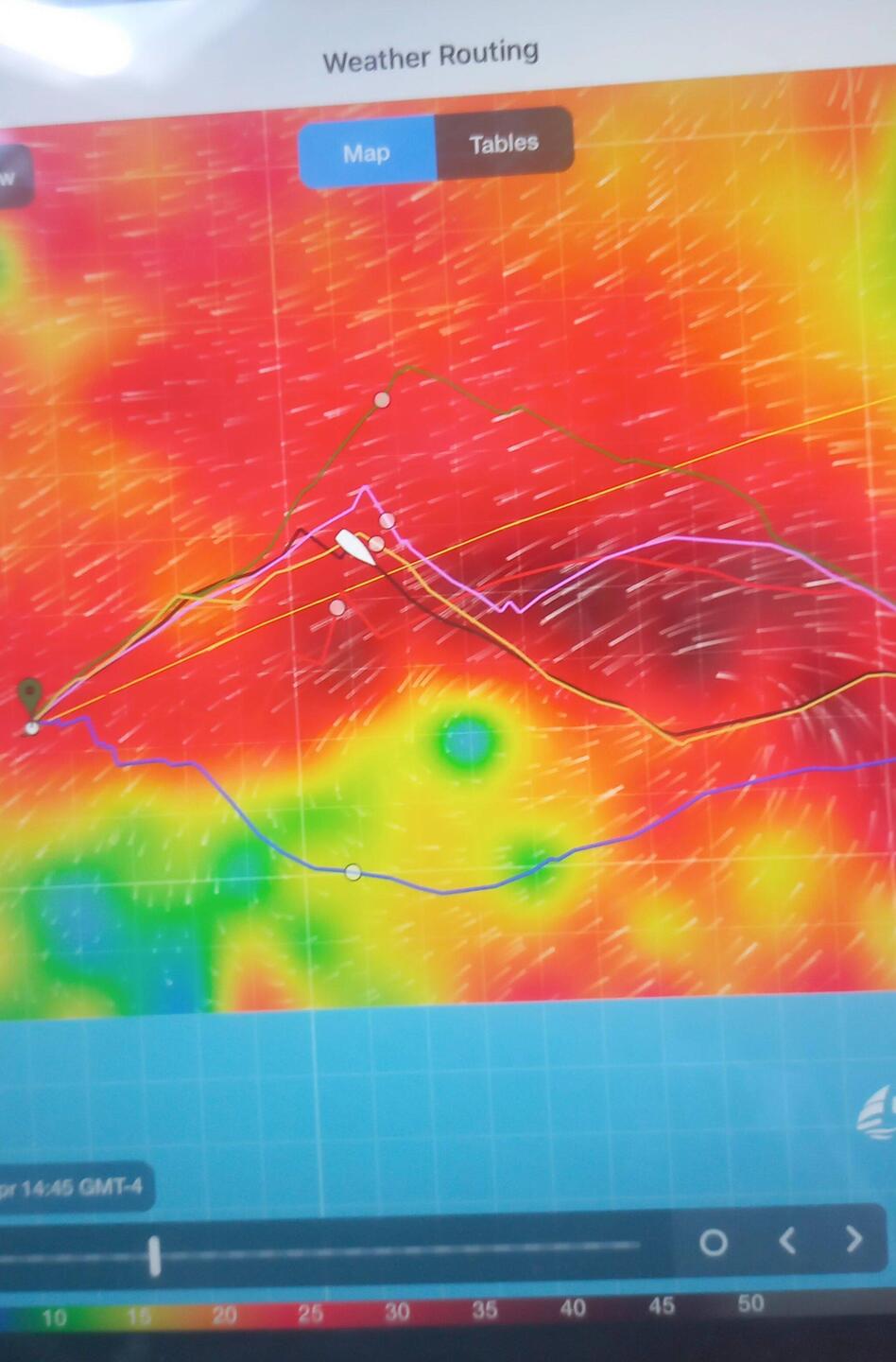 Le confort est bien revenu à bord, les paquets de mer submergeant le pont sont de l'histoire ancienne. On devrait pouvoir ouvrir (aérer) le bateau. Nous conservons toujours une légère avance sur les routages théoriques ce qui nous met à l'abri de mauvaises surprises comme arriver trop tard vis à vis d'une aggravation météo (il est plus facile de ralentir que d'accélérer). Nous avons presque gagné 24h entre le routage du 1er jour et celui de ce matin (je l'actualise toutes les 12h). Nous conservons ainsi une marge confortable vis à vis de l'aggravation météo prévue le 8 avril sur les Bermudes. Les polaires de routage fournies par l'application Predictwind (vitesses théoriques du voilier en fonction de la force et de l'angle du vent) sont souvent optimistes, il faut donc y ajouter une légère pénalité afin de coller à la réalité. Je pense avoir trouvé le bon compromis en pénalisant de 10% les polaires théoriques de l'Océanis 430.