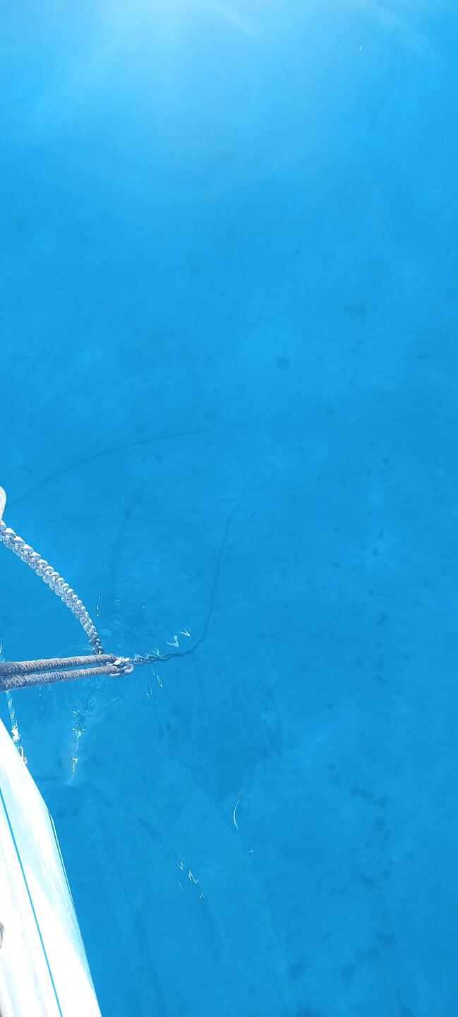 Il est 17h, Touk arrive à son tour et pose son ancre derrière nous. Baignade express, plongée pour vérifier l'ancre... coincée dans une vieille chaine à 7m de fond... Nous avons eu la bonne idee d'aller checker l'ancre avec masque et tuba : nous constatons que celle ci est prise dans une vieille chaine sur le fond. La tuile ... Le tout à 7m de profondeur à marée basse. Je tente une plongée : le tout est vien lourd et notre ancre difficile à déplacer. Après 3 plongées, je parviens à désengager l'ancre et à la déplacer 2m au delà de cette foutue chaine.