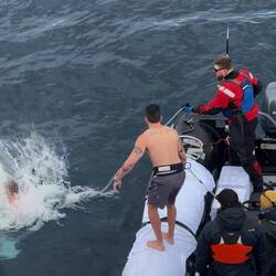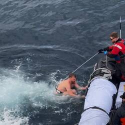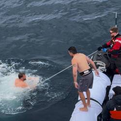 Während Christian ins Wasser springt zeigt sich unweit wieder ein Wal.