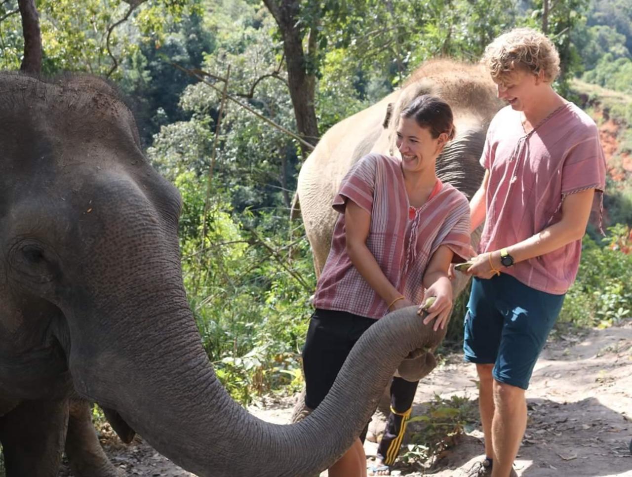Danach geht es gleich runter zur ersten fütterungs Runde. Es gibt Bananen, Kürbis und Zuckerrohr. Elefanten essen pro Tag rund 250Kg, da muss also einiges gefüttert werden. Es ist faszinierend wie geschickt und feinfühlig die Elefanten ihren Rüssel zum Greifen einsetzen. Nach der Fütterung und vielen Fotos machen wir einen kleinen Spaziergang mit den Elefanten. Spaziergang würden wir es nicht nennen. Wir gehen ein paar hundert Meter den Hügel hoch in ein Waldstück. Erstaundlich wir gut die Elefanten den Trampelpfad nehmen können. Oben lassen wir die Elefanten rumlaufen, essen, sich kratzen und machen natürlich wieder Fotos. Da wir eher der Meinung sind, dass Elefanten keine Streicheltiere sind, halten wir uns dabei zurück. Obwohl uns klar ist, dass das Habitat von Touristen lebt und die Fotos hilfreich sind, haben wir trotzdem eine grössere Abneigung dagegen.