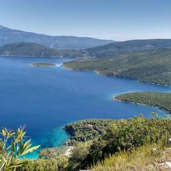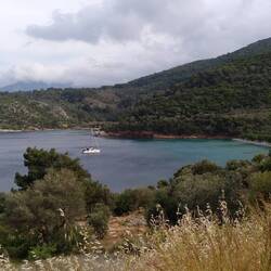 Die Tasse Kaffee entwickelt sich zu einer ausgiebigen Unterhaltung mit diesem freundlichen und faszinierenden Mann. Sein Englisch hat er aus sieben Jahren Arbeit in Australien mitgebracht, leider nicht gut - nach seinen Worten, wir sahen es anders -weil er immer mit Griechen zusammengearbeitet hat. Schwere Arbeit, am Bau, aber gutes Geld. Er erzählt von den Umständen dort, von seinen Kindern und Enkelkindern, von seiner im letzten Jahr verstorbenen Frau, und man merkt ihm den Schmerz noch immer an. Er hat immer gern getanzt, jetzt nicht mehr. Er stellt sich vor als Johnny und ist beeindruckende 95 Jahre alt. Wir laden ihn auf einen Ouzo ein (auch am Vormittag kein Problem 😎) und plaudern weiter. Schließlich will er uns noch sein Dorf zeigen. Zielstrebig führt er uns zur ältesten Kirche, nur noch eine Turmspitze eigentlich, und dann zu seinem Lieblingsausblick über die Berghänge am Dorfrand. Die vielen verschiedenen Baumarten haben es ihm besonders angetan.