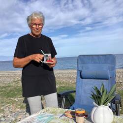 Die Sonne scheint, aber der Wind ist doch kühl. Mit den Füßen hab ich das Wasser getestet, aber zum Baden ist es mir dochBaca lagi