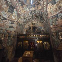 Rila Monastery has spectacular architecture and frescos. It survived the Ottoman Empire as it was protected by the Sultans of the times. It's very peaceful now and attending the 5pm mass was very calming and peaceful. The mass was sung and chanted. The Rafail Cross is housed in the museum here. The cross is hand carved out of wood which took the craftsman 12 years to complete, with 650 people carved in the cross. Rafail lost his sight when the cross was finished. Very intricate and precise work. Dinner was half a leftover sausage and bread from lunch and an old sausage roll from day before. We were too full to eat much more.
