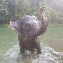 War die eine Elefantenseite sauber geschrubbt, dann erfolgte das Kommando der Guides, der Elefant stand auf und ließ sich auf seine andere Seite fallen und das Spiel begann von Neuem. Doch das Beste kommt bekanntlich immer zum Schluss. In diesem Fall war es eine höchstpersönlich Elefantenrüsseldusche vom lieben Theo, der zuvor noch von Jörg und Leander geritten wurde. Also hieß es Plätze einnehme, Theo saugte voller Vorfreude Wasser ein, sein Rüssel hob sich, Augen zu und Wasser Marsch! Unglaublich! Für knapp 10min wurde jeder von uns von Kopf bis Fuß angetrötet und wenn das keine waschechte Dschungeldusche war, dann weiß ich auch nicht! :D