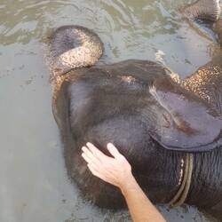 Es ging ans Elefantenwaschen! Nachdem jeder Elefant kurz im Fluss untergetaucht war, legten sie sich im kniehohen Wasser auf die Seite und das war das Stichwort, sich Bürsten zu greifen und die Elefanten ordentlich sauber zu schrubben. Nebenbei wurden sie von uns auch mit Kürbis gefüttert und wer hätte gedacht, dass so ein Elefantenrüssel so ein flinkes und geschicktes Werkzeig sein kann. Kaum war der Kürbis auch nur in Rüsselreichweite, wurde dieser angesaugt und schwupps! Schon war das Stück im Maul verschwunden und neue wurden angefordert. Da kam man gar nicht wirklich zum Putzen, wenn der Elefsnt solchen Kohldampf hatte. ^^