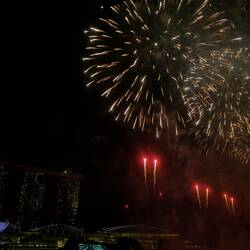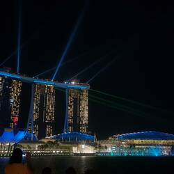 Um alles aus diesem Tag noch rauszuholen, entscheiden wir uns, noch einmal zum Garden by the Bay zu fahren und den dortigen Skywalk in luftiger Höhe zu buchen. Trotz langer Schlangen und der Gefahr, dass das Ticket bei Regenbeginn verfällt, stellten wir uns an und waren nach knapp 20 Minuten inmitten all der Drahtbäume, wovon zwei über eine Art Brücke miteinander verbunden waren und für ein spektakuläres Panorama sorgten. Zur unserer Überraschung gab es dann auch noch eine knapp 10 minütige Musik- und Lichtershow, die von oben natürlich noch viel unglaublicher zu betrachten war, als wenn wir auf dem Boden gestanden hätten. Unzählige Fotos später und mit knurrendem Magen ging es dann zurück auf den Boden und in Richtung Luxushotel, das Marina Bay Sands, welches bei Nacht noch beeindruckender aussah, als am Vortag bei Sonnenlicht.