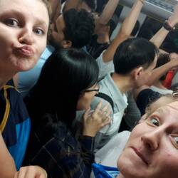 Sitzend guckten wir uns an, das letzte Selfie des Tages wurde geschossen und jeder griff zu seiner eben ergatterten Flasche. In meinem Fall Orangensaft und in Johannas Schwarztee. Um den anderen von seinem Getränk zu überzeugen, wurden natürlich auch die Flaschen noch herumgereicht, was anscheinend für sehr missbilligende Blicke sorgte. Die Dame gegenüber von uns hätte mit Blicken töten können... Ich fragte mich gerade noch, was denn ihr Problem sei, bis mir das Schild über ihrem Kopf auffiel. Panisch wurden meine Augen größer, denn man konnte klar und deutlich lesen, dass in der Metro essen und trinken verboten ist und darauf eine Strafe von 500 Dollar steht. Scheiße! Im gleichen Moment hat wohl Hanne das Schild ebenfalls gesehen, ihre Augen wurde genauso riesig wie meine, die Flaschen wurden zugeschraubt, in den Rucksack geworfen und Gott sei Dank waren wir an unserer Haltestelle angelangt, sodass wir wortlos aus der Metro rennen konnten. Panisch lachend kamen wir oberhalb der Rolltreppe an und wussten nicht so ganz weiter. Denn dieser Fauxpas könnte uns im schlimmsten Fall insgesamt 1000 Dollar kosten...