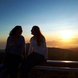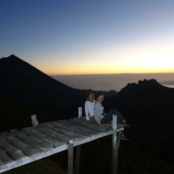 Nach weiteren 3 Stunden landen wir, wie auch unser Gepäck, sicher in Bajawa. Zu Fuß laufen wir zu einem Aussichtspunkt der einen fantastischen Ausblick auf den Sonnenuntergang garantiert und treffen auf dem Weg zahlreiche Kinder, die uns winken, Wetten abschließen, ob sich einer traut, uns zu fragen, wie wir heißen oder wo wir herkommen und mit uns Fotos machen wollen. Netter Weise gabeln uns Einheimische mit ihrem Pick-Up auf und wir werden auf der Ladefläche Richtung Gebirge eskortiert. Am Aussichtspunkt angekommen, nimmt das Foto schießen kein Ende. Selbst für Leute, die für uns selbst wie Touristen aussehen, scheinen wir eine Art Attraktion zu sein. Jule: "Woah, ich habe mich noch nie so berühmt gefühlt ^^"