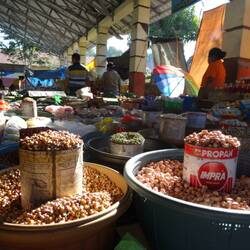 Der nächste Morgen startete mit der angekündigten Shopping Tour über den einheimischen Markt. Elvis hatte wohl nicht damit gerechnet, dass wir tatsächlich warten würden, bis der ganze Markt öffnet. Denn als er um 9 Uhr am Markt hielt, setzte er wohl insgeheim darauf, dass wir nach 20min wieder ins Auto steigen würden. Anscheinend war er nicht im Bilde, dass 4 Mädels auch auf 20 Quadratmetern genügend Klamotten und Ruhe finden, um eine 3 stündige Shopping-Tour zu starten. Mit der Zeit öffneten mehr und mehr Läden und der arme Elvis legte sich ins Auto, um ein Nickerchen zu halten. Die einzelnen Läden muss man sich wie Garagen vorstellen, in denen die Kleidung an Bambus-Stangen aufgehangen wird. Spiegel gibt es nicht. Die Einheimischen stellen ihr Handy mit Innenkamera auf, wir konnten immerhin einander fotografieren. Achja, Umkleiden gibt es auch nicht. Entweder man zieht die Klamotten über die eigene Kleidung oder findet eine leere Garage, an dessen Tür der eine dann Schmiere steht. Ihr könnt es Euch vorstellen: wir hatten eine Menge Spaß! Allein das Verhandeln oder Aussagen wie "Was?! 30.000Rp für das Shirt, der spinnt wohl?! Ich gebe ihm maximal 10.000Rp (0,64€)!" zeigen, dass wir mittlerweile so richtig angekommen sind in Indonesien. Mit 5 Shirts, 3, Blusen und 2 Kleidern sprangen wir wieder ins Auto. Wobei man sagen muss, dass lediglich 2 Kleidungsstücke auf meine Rechnung gehen und der Rest nun von Jule für die nächsten 5 Wochen im Backpack getragen und ertragen werden muss. Vorhin wurden schon fleißig Anfragen nach Hause verschickt, ob Jules Dad nicht mit weniger Gepäck anreisen kann, damit Jule ihm ihre Sache überhelfen kann und wenn das nicht, dann immerhin 2 weitere Vakuum-Tüten aus Deutschland mitbringen könne. Ich glaube nicht, dass das was wird, aber ich möchte ja Jules Illusionen nicht zerstören. ;) (Kommentar Jule: Sehr lieb von dir, aber zur Not zieh ich halt 5 Kleidungsschichten übereinander :D )