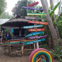 Nach Pancakes und Tee-Frühstück fahren wir zu dem traditionellen Dorf Luba, in dem die Einheimischen komplett auf Dinge wie Stahl verzichten und ihre Häuschen nur mit Bambus bauen. Elvis erklärt uns, dass in der Mitte auf dem "Dorfplatz" Tiere geopfert werden. Für eine Hochzeit beispielsweise muss der Mann für 25 Mio. Rp (umgerechnet 1600 Euro) einen Bullen kaufen, was für indonesische Verhältnisse ein Vermögen bedeutet, und ihn dort, am besten zusammen mit ein paar Schweinen, schlachten. Dafür werden bestimmte "Schirmchen" genutzt, wobei jede Familie im Dorf ihren eigenen besitzt. Der Bulle wird festgebunden, gestreckt und ihm wird schließlich die Kehle durchgeschnitten. Es verwundert also nicht, dass an jedem Haus zahlreiche Hörner und Schweine-Kiefer bammseln und die Baumstämme der Schächtbäume mit Blut verschmiert sind. Auf den Terassen der Häuser sitzen die einheimischen Frauen und weben Teppiche. Und wie ich schon vorher erwähnte, sind die Menschen hier sehr zugänglich und freundlich. Kaum hatte ich mich also zu einer solchen Terasse begeben, erhielt ich auch schon eine wortlose, herzliche Einladung zum Blätter-Snack, indem mir die Einheimische ein Bündel Blätter auf ihrer Hand entgegen streckte. Schon vorher war uns aufgefallen, dass die Frauen oft blutrote Lippen und Zähne haben, aber wir dachten, das wäre eine Art Stammesbemalung oder einfach nur schlechter Lippenstift. :D Weit gefehlt! Denn keine 20s später, sah mein Mund genauso aus. Die Blätter in der einen Hand haltend, kramte die ältere Dame (sie war 94) in ihrer Handtasche aus Bananenblättern und brachte eine kleine Dose zum Vorschein, mit der sie zermahlende Koralle auf die Blätter schüttelte. Zuletzt schmückte eine Nuss die kulinarische Mutprobe. Denn was bitte hätte ich sagen sollen? "Behalt mal schön Deine Blätter!", nein, das wäre nicht gegangen. Also Augen zu und durch bzw. Schnute auf und kauen, aber nicht runter schlucken! Unser Guide versicherte mir jedoch, dass ich maximal Kopfschmerzen bekommen würde, weil ich nicht an die Blätter gewöhnt bin und nicht zu doll kauen sollte. :D Schnell überkam mich der bittere Geschmack, gepaart mit dem leicht knirschenden Korallenstaub. Die Einheimische ermutigte mich mit Handzeichen, länger zu kauen, aber Jule gefiel das gar nicht "Spuck das aus! Ich kann es nicht gebrauchen, dass Du davon high wirst!". Und wie immer hörte ich auf mein Julchen und ließ die rote Paste in einem Taschentuch verschwinden. Der alten Lady schien das nicht zu gefallen, aber immerhin waren ihre Zähne auch schon fast alle ausgefallen, wohingegen an meinen nun eine bittere Schicht klebte. Die Einheimischen benutzen diese Blätter als Zahnputz-Ersatz, ich würde dann aber doch gerne bei der herkömmlichen Zahnbürste bleiben. Zumal sich die Zähne dadurch irgendwann schwarz verfärben. Mit leicht entsetzten Blicken in unserem Rücken verließen wir den Dorfplatz und liefen auf eine Schule zu. Da gerade Pause war, schmulten wir in einen Klassenraum, was nicht unbemerkt blieb und schwupps, schon waren wir umringt von uniformierten Kids und wurden vor die Tafel gezerrt. Aber anstatt jetzt Lehrer zu spielen, wurden wir quasi zum privaten Fotograf ernannt und jedes Kind wollte ein Foto mit sich und seinen Klassenkameraden schießen. Von Grimassen über breites Grinsen bis hin zum High-Five. Den eigentlichen Lehrern zuwinkend, die draußen Pause machten, besuchten wir den Kindergarten ein paar Meter weiter. Auf einem vertrockneten Feld zwischen Kindergarten und Schule wurde akribisch Fußball gespielt und daneben gewippt, wobei der eine natürlich den Anderen "verhungern lassen" wollte. Nach ein paar Tränen und Ausnutzen des Hebelgesetzes konnte der Kleine wieder beschwichtigt werden. Nach dem Dorf und einer ordentlichen Mundspülung, um die rote Paste loszuwerden, fuhren wir weiter zu heißen Quellen. Bestimmt 2 Stunden saßen wir in einem Becken, in dem sich 2 Flüsse treffen. Einer direkt aus der heißen Quelle mit 50°C und der andere mit nur 15°C. Je nachdem, ob noch jemand in der Nähe stand, wurde die Strömung umgelenkt und dann konnte auch mal eine ganz heiße oder eben ganz kalte Wassermasse angerollt kommen. Aber auch mit dem Oberkörper im warmend liegend, konnte man seinen Zeh immer noch ins Kalte stecken. Ihr seht schon, man kann sich damit eine Weile beschäftigen, welchen Arm man nun wo hin hält. Nach unserem Bad und einer riesen Schüssel Reis mit Gemüse, wobei wir uns nicht sicher sind, ob nicht doch mit dem Schwefelwasser gekocht wurde, zeigte uns Elvis einen Cashew-Baum. Jule und ich werden uns nun wohl nie wieder beschweren, dass Cashew-Kerne teuer wären. Denn jetzt Frucht bringt nur 1 Cashew-Kern und diesen dort raus zu pulen, ist echt aufwendig. Mit ein paar Cashews in der Hand ging es Richtung Fruchtmarkt. Dort kauften wir bei Elvis Tante ein, weshalb die Mango besonders preiswert war. Jule und ich beschlossen, uns von der Gruppe abzunabeln und den Markt auf eigene Hand zu erkunden. Das Resultat 20min später war, dass Elvis uns auslachte, weil das vermeintlich tropische Obst, das ich gekauft hatte, sich als Schweinefutter und Gemüse rausstellte. Zum Glück konnten wir das Tierfutter gegen eine Limette eintauschen und die Einheimischen hatten ihren Spaß. Neben dem Fruchtmarkt entdeckten wir einen Second Hand Markt und woah, wir hätten einfach mit leeren Rucksäcken anreisen sollen! Jule ergatterte ein Kleid und eine Hose für 50.000 Rp (3,20€), ich ebenfalls, aber zu meiner Scham 80 Cent teurer. :P