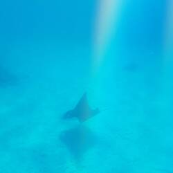 Die Korallen, die dort wachsen, brechen aufgrund der starken Strömung sofort ab, wenn sie eine bestimmte Höhe erreicht haben - deshalb der Korallen-Friedhof. Und dann sah ich sie vor mir: die Shot Gun. Eigentlich sehr friedlich aussehend. Vor der Shot Gun taucht man in eine sandige Kuhle, in der ein Weißspitzen-Riffhai auf einen Besuch vorbei kam, und dann muss man schnell sein. Denn sobald man dann aus der Kuhle heraustaucht, baut sich vor einem ein steiles Riff auf, an dem man schneller vorbei sausen kann, als einem lieb ist. Die Strömung fließt nämlich über die Kuhle hinweg. Das heißt, sobald man aus der Kuhle auftaucht, packt einen die Strömung und man hat nur wenige Sekunden, seinen Haken zu greifen und einen geeigneten Platz im Riff zu finden, um nicht davon gerissen zu werden. Und wie sollte es auch anders sein: Hanne fand keinen geeigneten Platz, zum Glück aber der Guide, der mich gerade noch so kopfüber paddelnd abfing und in einen Felsen einhakte. Da waren wir also: direkt in der Shot Gun und vor uns drehte der Weißspitzen-Riffhai seine Runden. Ihr könnt Euch nicht vorstellen, was für ein Gefühl das ist! Ich hätte nicht gedacht, dass ich es mag, aber es war einfach nur unglaublich! Ein bisschen Luft ins Jacket und schwupps, geht man hoch wie ein Ballon. Hände zur Seite und Du surfst in der Strömung. Nach etwa 10min des Spaßes in der Shot Gun, ließen wir uns weiter mit der Strömung treiben und fuhren an ein paar Mantas vorbei, die etwa 50m hinter der Shot Gun ihren Beauty-Salon genossen. Einer der Mantas war nur 2m von mir entfernt und musterte mich mit seinem großen Auge, während er majestätisch auf einer Stelle schwamm und von ein paar Fischen geputzt wurde. Leider hatte in der Shot Gun der Ocotpus von Manuela abgeblasen (was aufgrund der krassen Strömung und der Aufregung, sich richtig einzuhaken, anfangs nicht aufgefallen war), weshalb wir den Tauchgang schneller beenden mussten als geplant. Aber weil wir ja eh noch einen Tauchgang vom Vorabend offen hatten, beschlossen wir am nächsten Tag wieder zu kommen! ^^ Übrigens habe ich mich auch erst beim 2. Mal Shot Gun so richtig getraut, die Strömung zu genießen und nicht möglichst nah am Felsen zu kleben, um nicht, sollte der Haken sich lösen, an die Wasseroberfläche katapultiert zu werden. Es gab nämlich 2 worst case Scenarien für diesen Tauchgang.