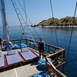 Am 06.09. sind wir also morgens auf das "Liveaboard" gegangen. Pünktlich um 7:30 Uhr saßen wir, typisch deutsch, im Tauchshop, um auf erste Anweisungen und die Kennenlern-Runde mit den anderen Teilnehmern zu warten. Doch leider ließen 2 Franzosen auf sich warten - allein am Zeitpunkt des Eintreffens wurden vorläufig Nationalitäten zugeordnet und später in der Kennenlern-Runde aufgedeckt, welche aus Name, Herkunftsland und bester Tauchgang bestand. Ihr seht schon, das Tauchen sollte ganz im Mittelpunkt der nächsten 3 Tage stehen. Man, wie hatte ich darauf gewartet! Schon 2 Tage lag der Komodo-Nationalpark direkt vor unserer Haustür und bis auf einen Schnorchelgang hatte ich noch nicht ansatzweise genügend Salzwasser inhaliert!