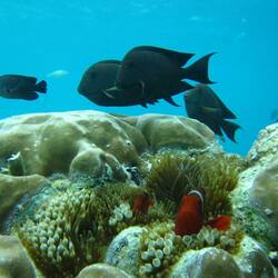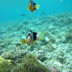Mit Ausblick auf kleine einsame Inselchen, die an uns vorbeizogen, ließen wir uns den Wind um die Nase wehen. Am ersten Tag wurden 2 Divespots im zentralen Teil des Nationalparks angefahren, wo ein Flying Gurnard (fliegender Knurrhahn :D ), ein Krokodil-Fisch, Drachenköpfe und eine weißgepunktete Moräne unseren Weg unter Wasser schmückte. Bei einem Blick nach oben zur Riffkante fiel mir der kleine Navy-Seal auf, der in seinem Schwimmshirt und schwarzer Leggins an der Wasserfläche schnorchelte. Mit 20m Höhenunterschied wunken Jule und ich uns zu und ich knippste ein paar Fotos, wie sie von ihrem Schnorchelguide mit Schwimmring begleitet wurde - da Jule die einzige Nicht-Taucherin an Board war, wurde ihr von unserem schwedischen Guide Matthias der Name "Mrs. Snorkeling" (kurze Übersetzung für unsere Omis: "Frau Schnorchlerin") verpasst. Und Mrs. Snorkeling durfte natürlich nie ohne Begleitung ins Wasser, um nicht aus Versehen mit der Strömung davon getrieben zu werden. Obwohl das eigentlich eher das größere Problem für ihre Schnorchel-Guides darstellte, die intelligenter Weise ohne Flossen, dafür aber mit ihrem Schwimmring ins Wasser sprangen. :D